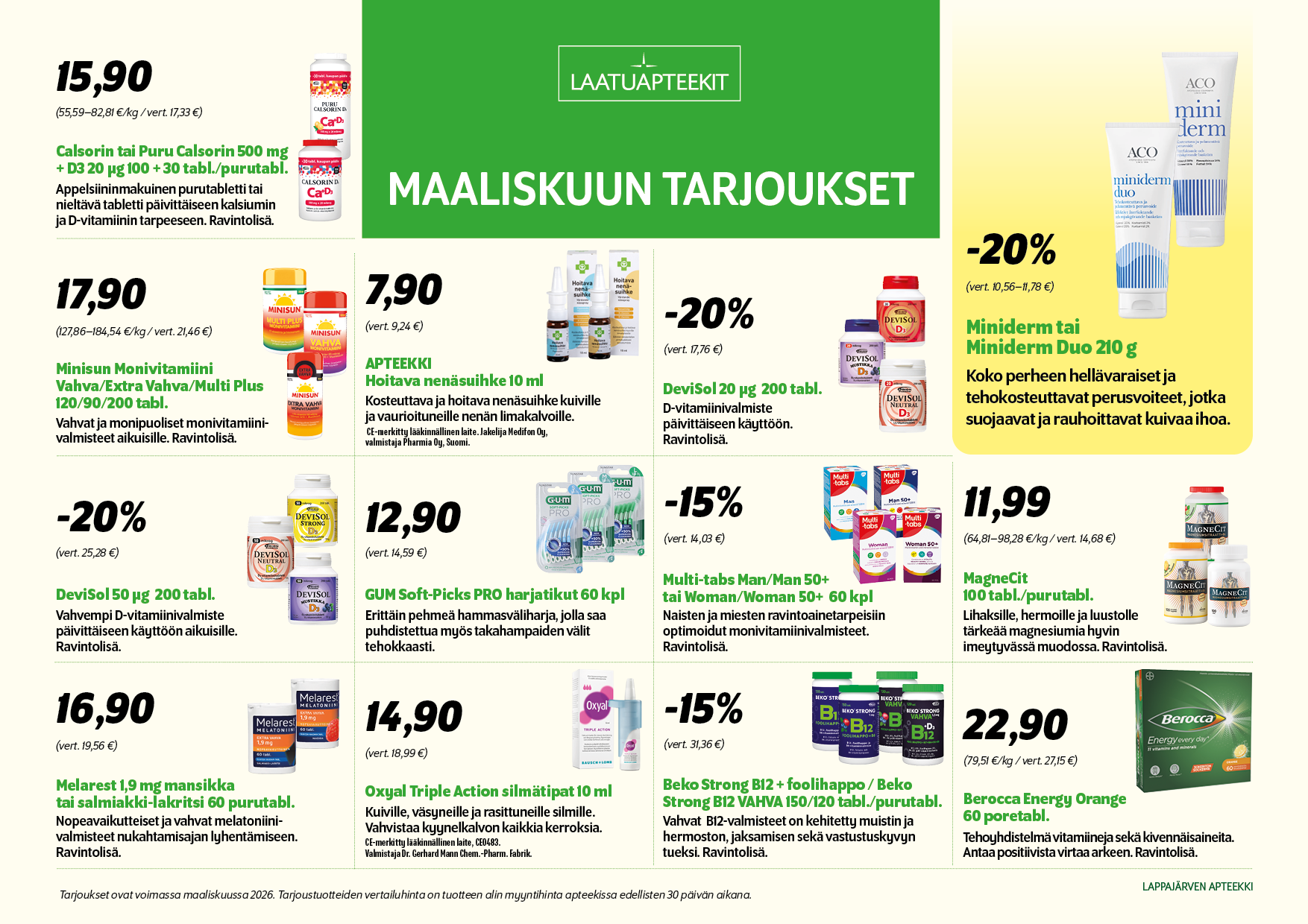 Vuoden 2026 alusta alkaen apteekissamme on voinut rokottautua kaikilla yleisimmillä rokotteilla. Toteutamme rokotuspalvelua yhteistyössä Rokotepiste-palvelun kanssa, joten rokotteeseen ei tarvita erillistä reseptiä etukäteen. Rokotukseen voi tulla myös ilman ajanvarausta, ja halutessasi voit varata ajan Rokotepisteen verkkosivuilta (www.rokotepiste.fi) tai soittamalla apteekkiimme 06 5661010.